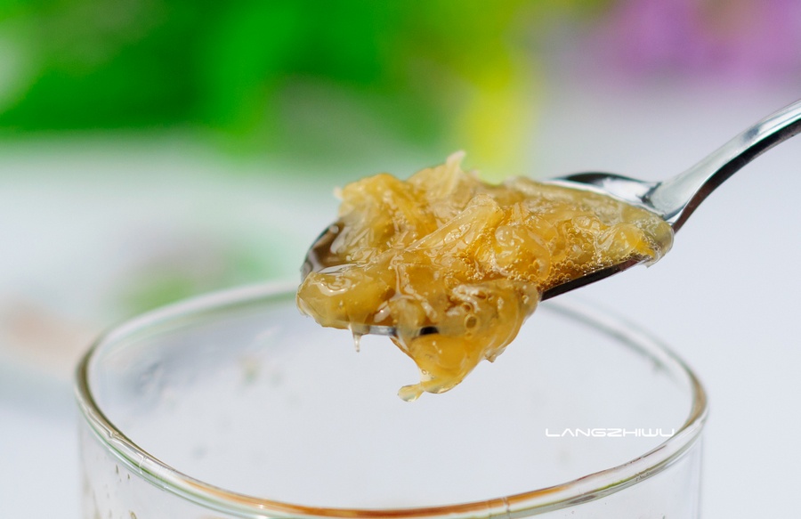 5、煮好的柚子茶晾凉后用蜂蜜调制,并浸泡数小时使蜂蜜浸入柚子果肉,做好的蜂蜜柚子茶色泽金黄,味道甜蜜中微带苦味。