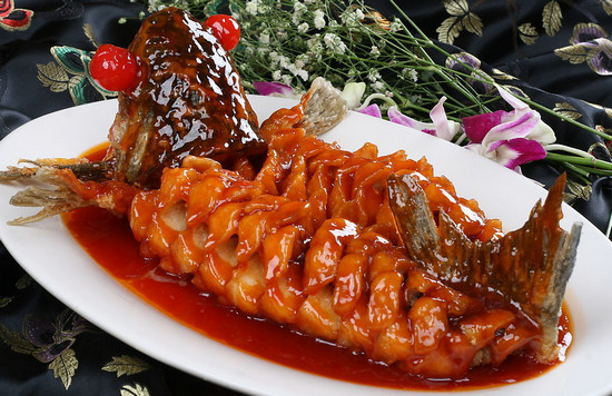 • 炒锅上火,烧热后倒入植物油,油热至七成,将桂鱼蘸少许淀粉,放油锅中炸数分钟,再将鱼头蘸上淀粉,放入油锅中炸,炸至呈金黄色捞出,将有花刀的一面朝上摆在鱼盘中,装上鱼头。