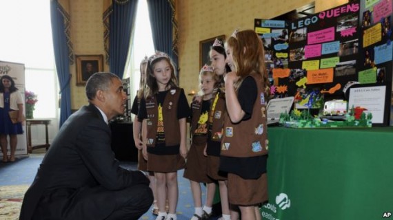 奥巴马总统参观了在白宫举办的科研成果展示会,他不时停下来与学生们讨论他们的科研项目。 一些女童子军成员向奥巴马展示了她们设计的,便于瘫痪者或是关节炎患者读书使用的翻页机。