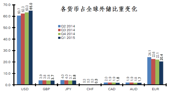 相应地,美元占全球储备的比重持续攀升。单纯从汇率变化来看,2014年3季度美元的比重应该升至62.3%,2015年1季度末升至65%。美元比重的上一个顶部刚好是65%,发生在全球金融危机前夕的2007年1季度。考虑到期间美元升值的因素,各国央行实际上将部分美元储备换成了其他货币。