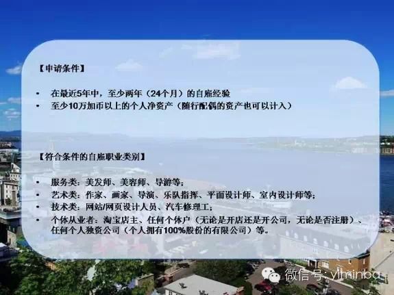 加拿大魁省自雇移民,对语言、经商背景、学历等要求均不高,而且不需要投资,不需要在当地创业,只要证明有10万加币(约合 60万元人民币)的资产,2年自雇经历,就能申请。而且,魁省自雇移民是一步到位拿绿卡——不需要先通过拿工作签证,几年后才能转绿卡。