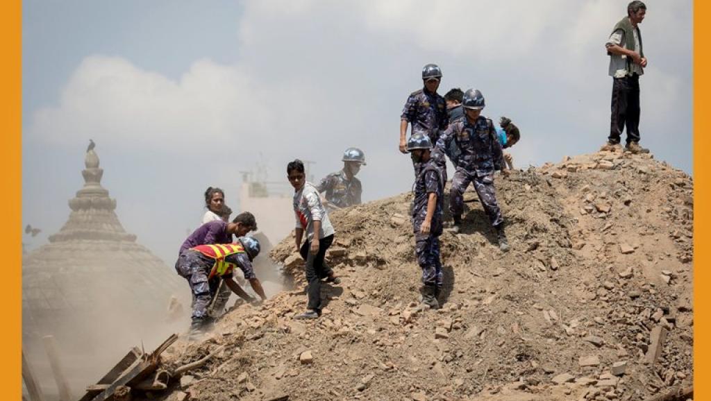 记者随中国国际救援队一支分队进入救援现场。当地一幢7层高楼坍塌在地,残破的被褥、水桶、衣物散落在瓦砾之间,废墟之下,六七名尼泊尔人已经被埋近48小时。