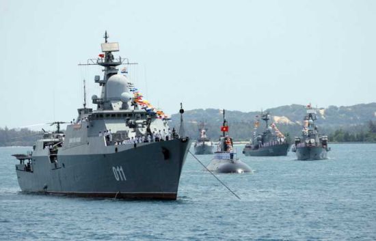 阅舰式上越南海军可谓精锐尽出,越南海军目前最强大的水面舰艇、满载排水量2100吨的“丁先皇”号护卫舰,以及著名的“基洛”级潜艇、“毒蜘蛛”导弹艇,以及P-15“冥河”反舰导弹均接受了检阅;越南海军陆战队也展示了步兵方阵,以及EXTRA增程火箭炮、BTR-60装甲输送车、PT-76水陆两栖坦克等装备。