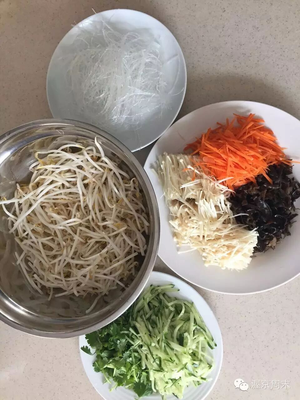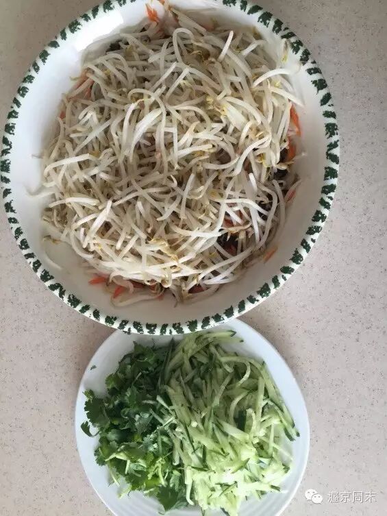 食材有:豆芽400克,金针菇150克,胡萝卜80克,黑木耳50克,粉丝40克,香菜40克,黄瓜150克。