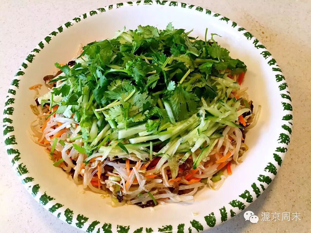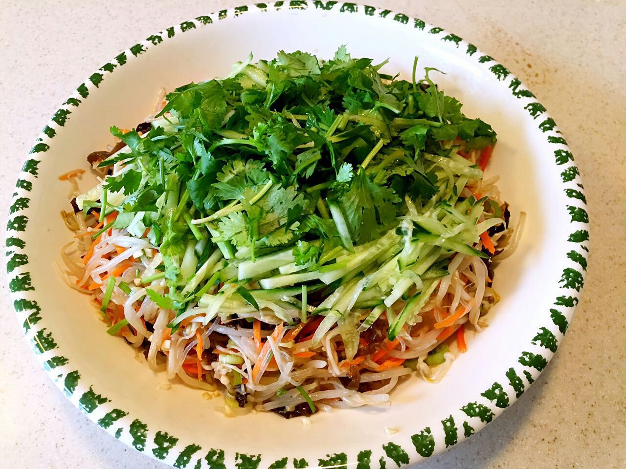 第六步:放入所有调料拌匀,最后撒上黄瓜丝和香菜。也可以撒一些芝麻和辣椒油。