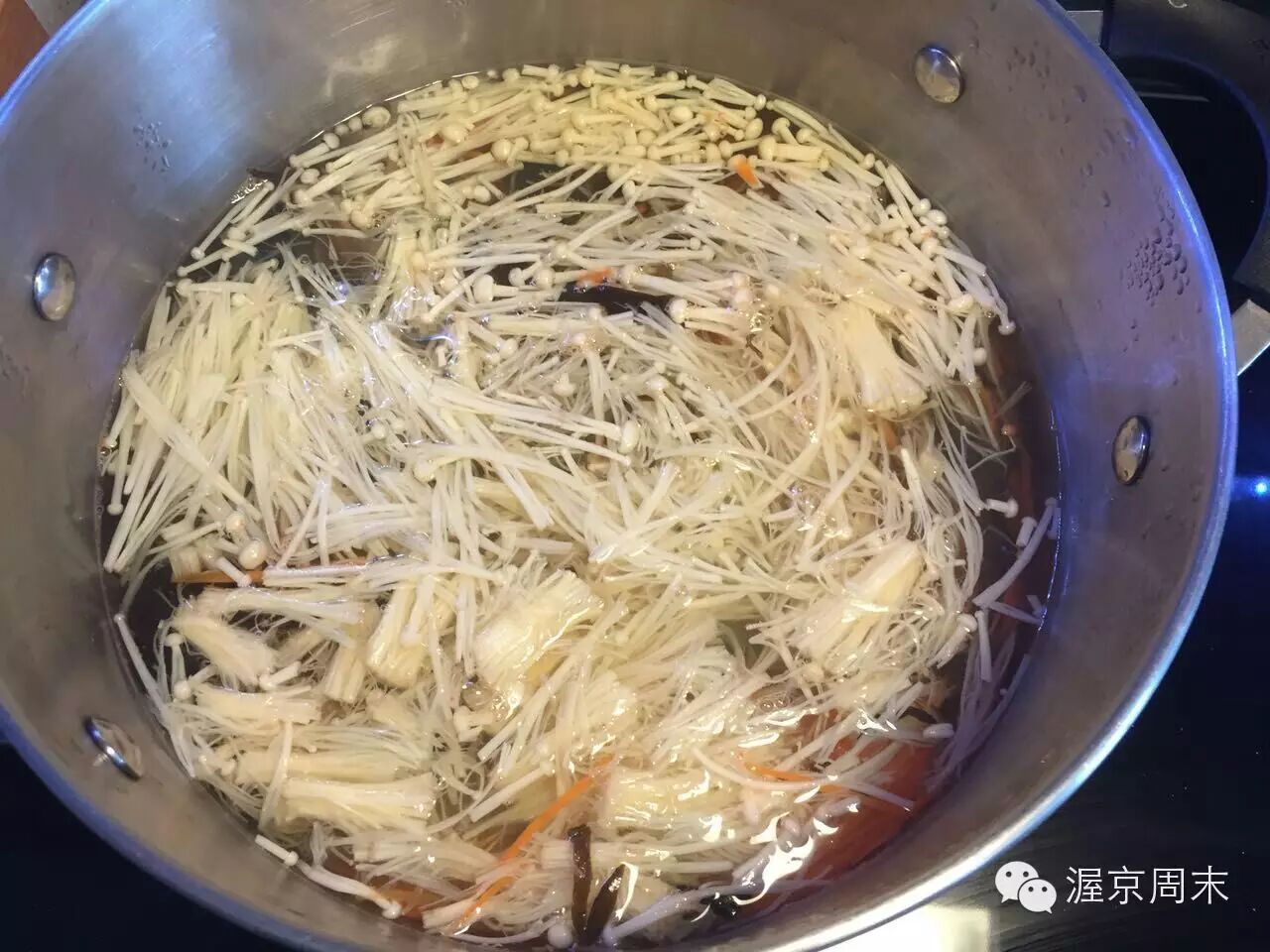 第四步:烧半锅水,水开后依次放入粉丝、胡萝卜、木耳、金针菇和豆芽。快速烫熟后。