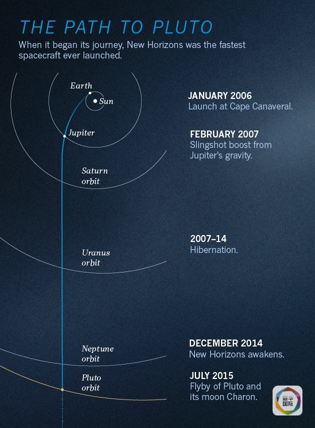 “新视野”号近十年来走过的路程如上图所示,它在2006年1月离开地球,在2007年2月飞过木星时借助其引力调整了飞行轨迹,然后就进入漫长的休眠期,直到2014年12月苏醒,因为这时它已经接近主要探测目标冥王星了。