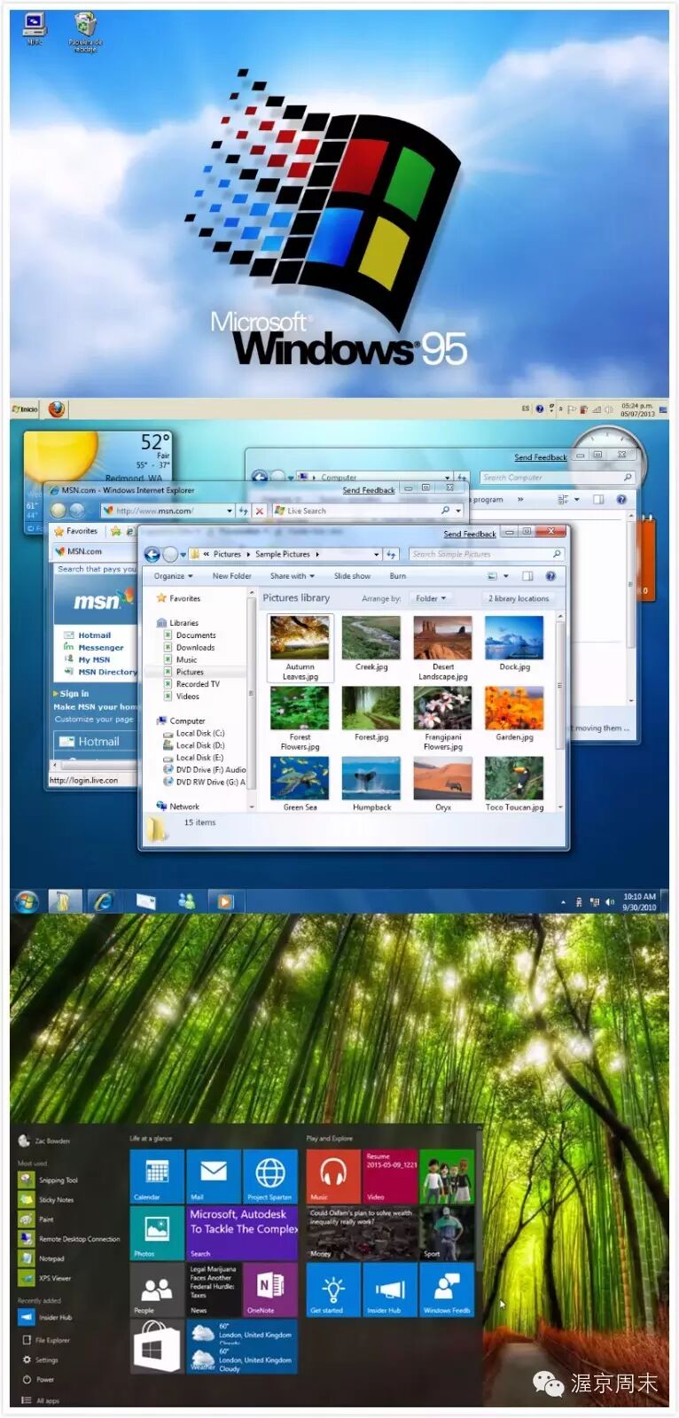 Windows 95、7和10三代桌面对比