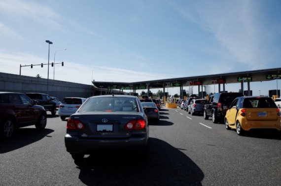 加元疲软,近两成加拿大人表示取消赴美国旅行的计划。图为卑诗民众驾车赴美在和平拱门通关站前排队等候通关。