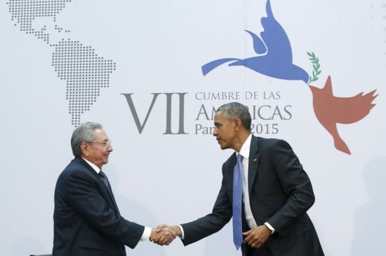 4月美洲国家峰会,奥巴马和劳尔-卡斯特罗握手