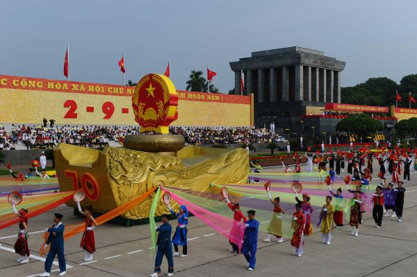 当地时间9月2日早上7点,河内的昇龙皇城(又称河内故宫)上空鸣响21声礼炮,3万多名士兵及民众组队通过巴亭广场,接受检阅。巴亭广场的一侧是胡志明主席纪念堂,1945年9月2日,胡志明就是在这片广场上宣告越南独立。