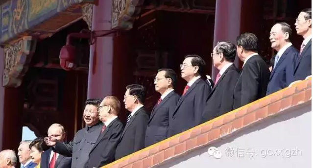 城楼最前一排的正中央是习近平,他的右侧为普京和朴槿惠等各国嘉宾,左侧依次为两位前任总书记江泽民和胡锦涛,以及现任6位政治局常委和已经退休了的前正国级老同志们。老同志后方一排是现任的政治局委员们。