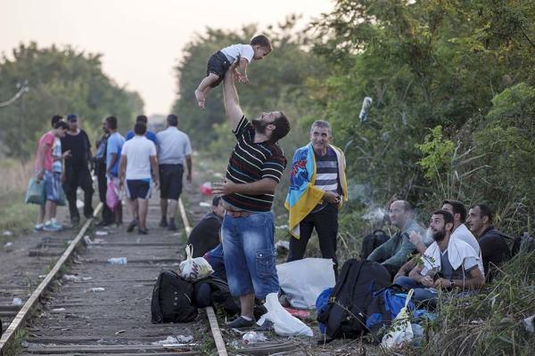 当地时间2015年8月31日,塞尔维亚霍尔果斯,一位移民将孩子高高举过头顶,这些移民沿铁道走向边境试图进入匈牙利。此次移民潮被认为是二战后最严重的移民危机。