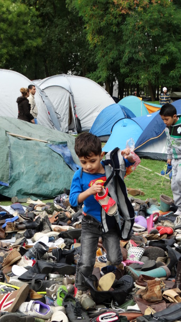 加拿大公民团体要求政府加速收容难民。图为在布鲁塞尔难民营中的男童,在寻找适合自己的鞋子。