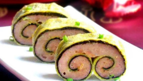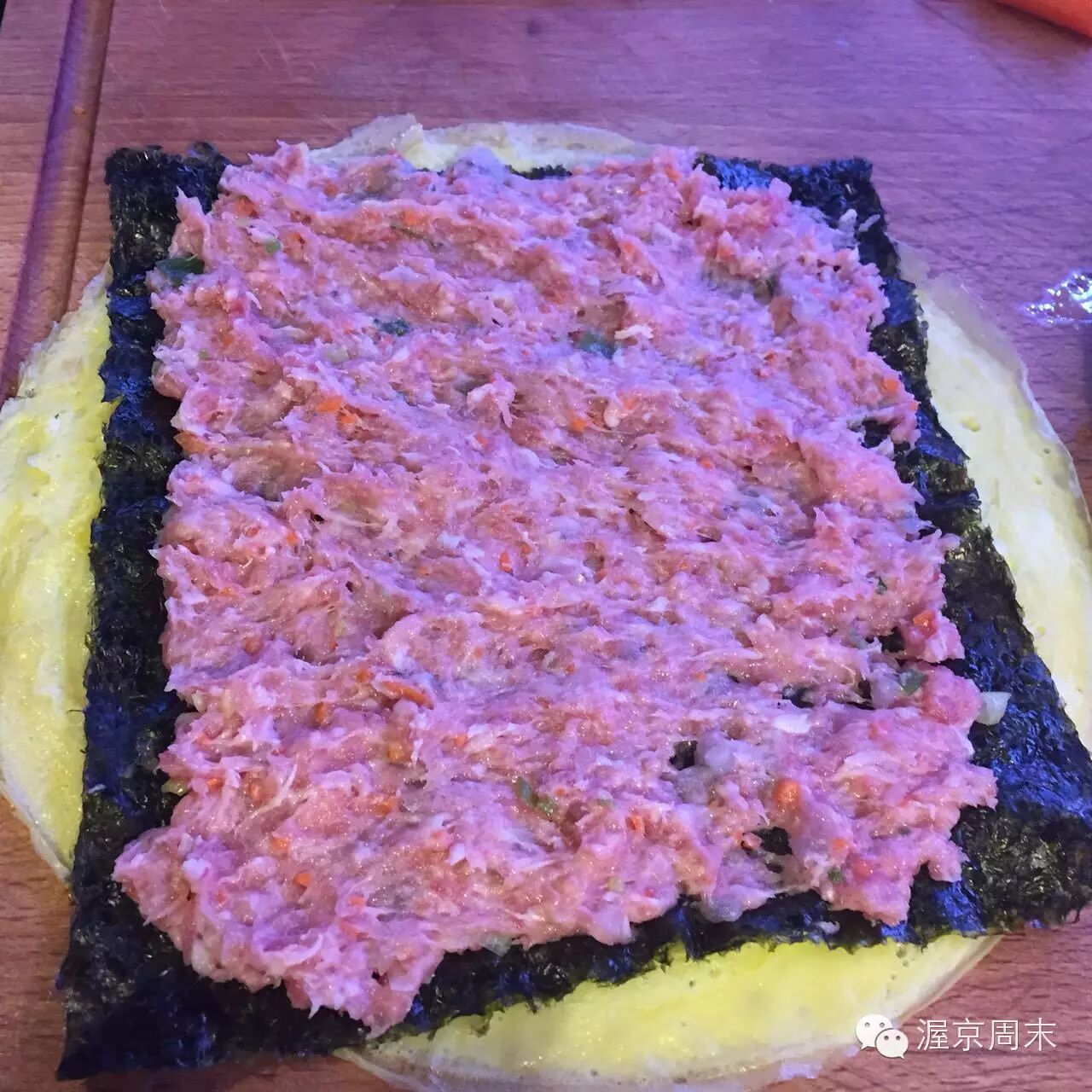 4. 蛋皮上放一张紫菜,倒入一半的肉馅。抹平,卷起成卷。