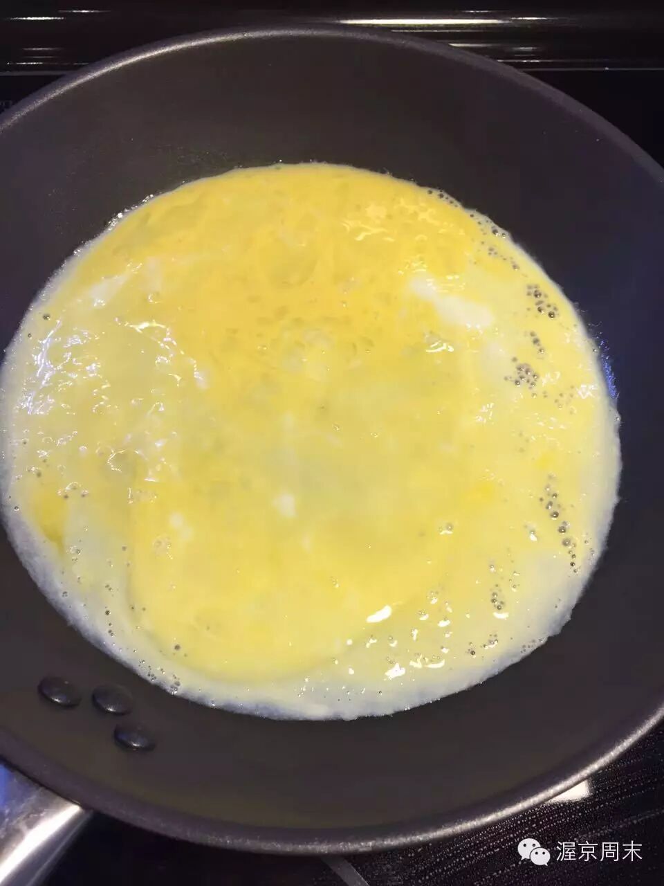 2. 开小火热平底煎锅。用油抹一下锅底,倒入一半的蛋液煎成蛋皮。