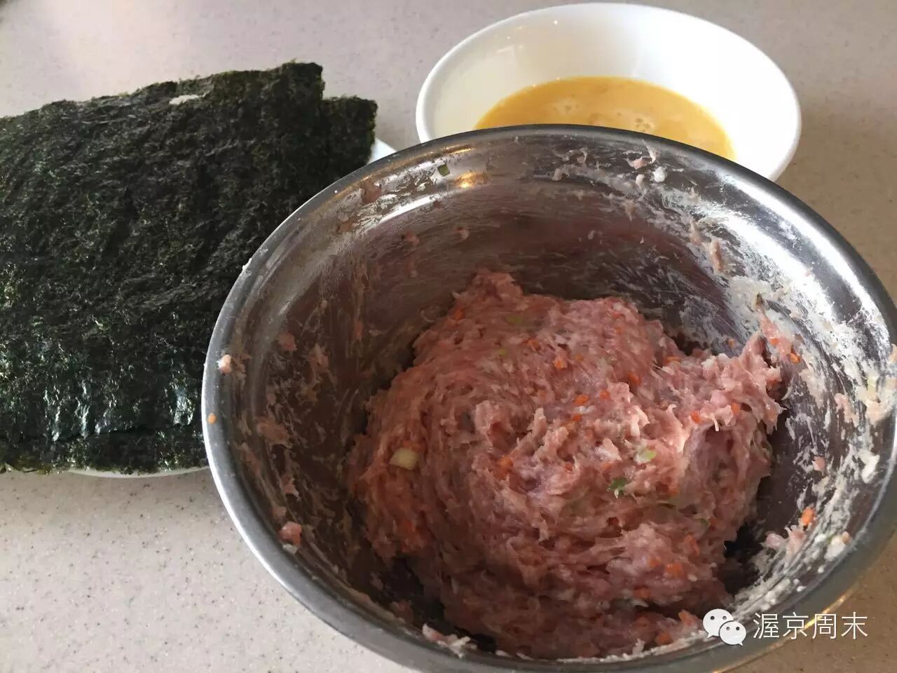 1. 把鸡蛋在碗里打匀,胡萝卜和葱切成末.虾剁成泥。 依次把所有的馅料部分加入肉糜拌匀。