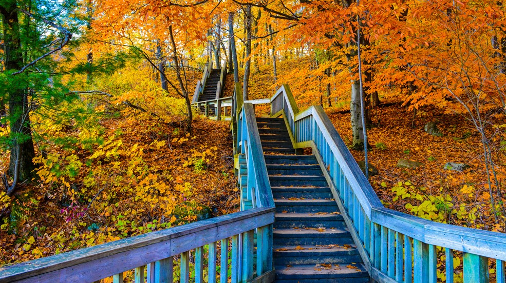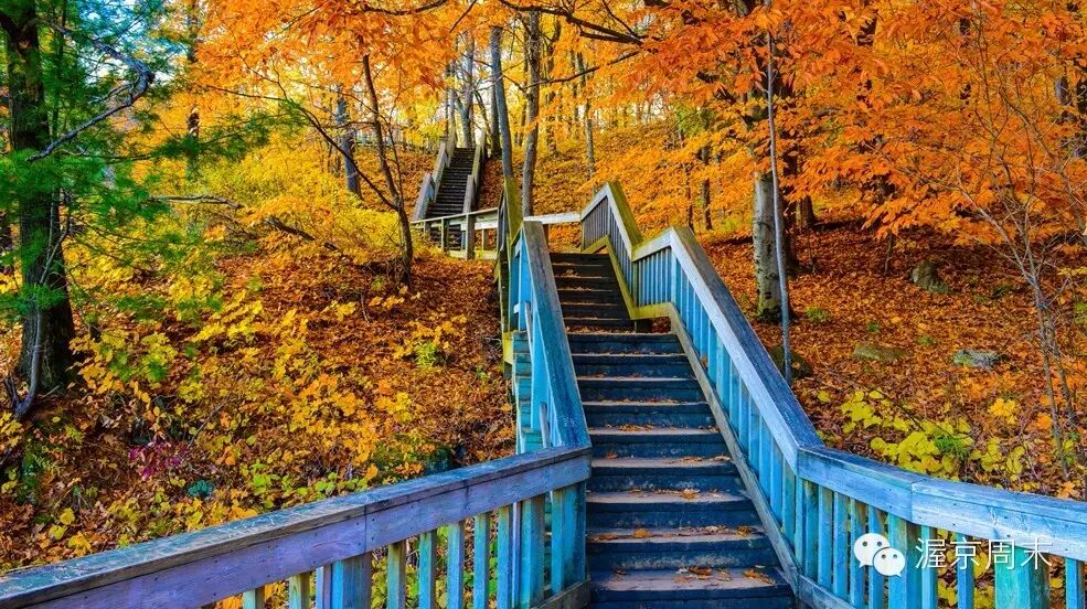 到达Mackenzie King Estate,可以通过旁边的Lauriault-Waterfall环形栈道,设有景观台。整个栈道被各种颜色的枫叶笼罩着,十分梦幻。