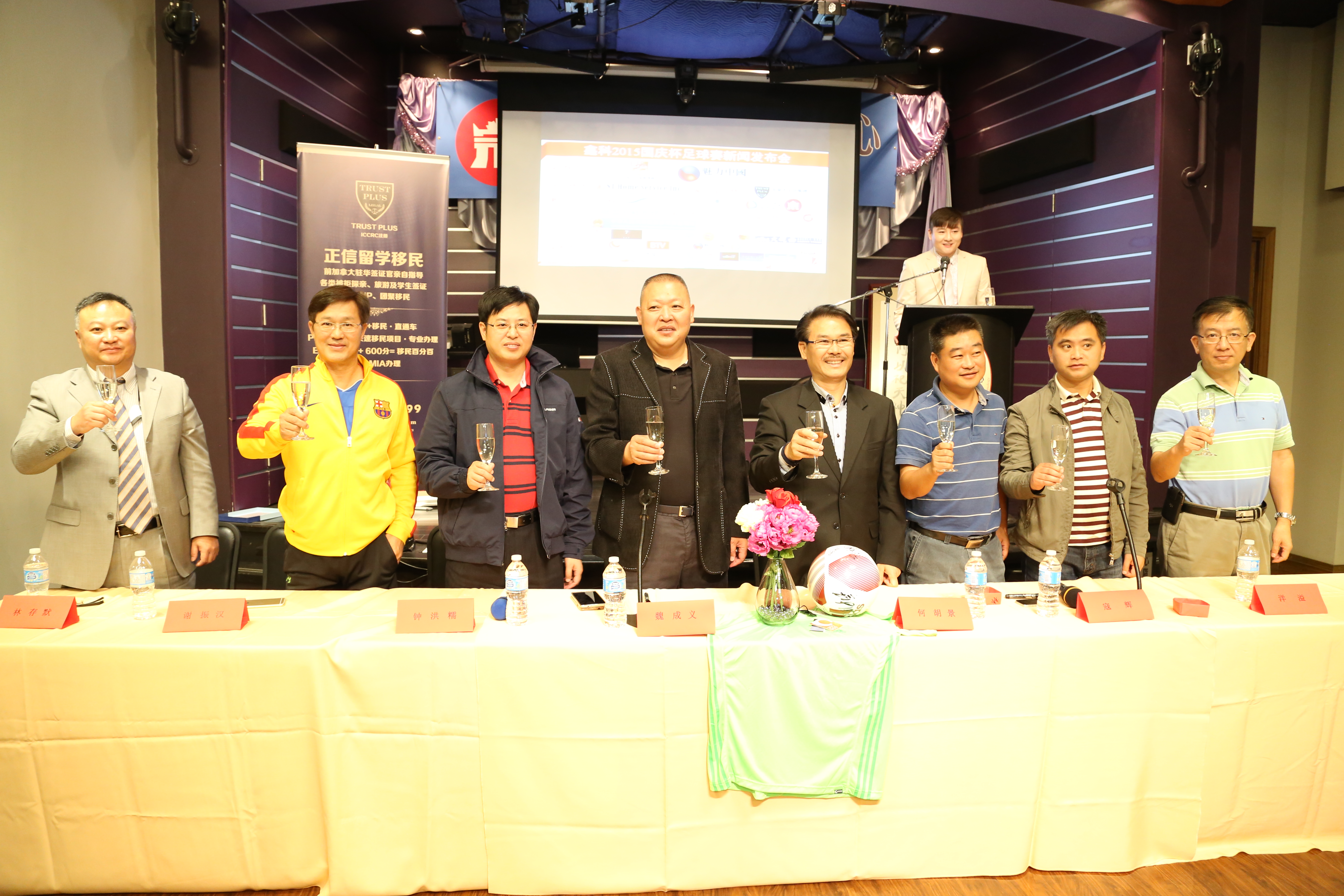鑫科2015国庆杯足球赛新闻发布会于9月20日在万锦华夏中心举行,参会嘉宾:华联总会和闽商总会双重主席魏成义、中华人民共和国驻多伦多领馆侨务领事种洪糯、万锦市何胡景议员、魅力中国中文电视总经理寇辉、多伦多华人足球总会会长谢振汉;冠名赞助商鑫科集团总经理关键先生、胸前背后赞助商正信集团总经理陈猛女士;以及来自协办方CPAC副会长王体、国际电视的王劲林导演、加拿大华夏中心主席林存默等。