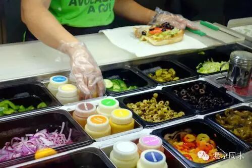 蔬菜有:洋葱Onion、莴苣Lettuce、西红柿Tomato、黄瓜Cucumber、青椒Green Pepper、小黄瓜Pickles、橄榄Olives、香蕉胡椒Banana Peppers、盐Salt、胡椒Pepper、墨西哥辣椒Jalapeno Peppers、意大利香料Oregano、切碎的胡萝卜Shredded Carrots等。