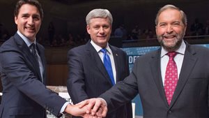而自由党领袖小特鲁多则谴责保守党领袖哈珀在中东地区的立场是“有战争加拿大就应参加”;同时指责新民主党领袖穆凯尔的立场走向另一个极端,“什么战争加拿大都不应该参加”;小特鲁多认为正确做法应该是加拿大积极参与培训当地武装的工作,以使得当地武装具有与ISIS 作战的能力。
