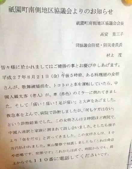 事情由一张网络流传的日语告知书引发。该告知书大意为:2015年8月21日下午5点左右,京都一名餐厅女老板,驾车在祗园歌舞练习场前缓慢行驶时,一名中国老人突然倒在倒车镜前大叫痛死了,女老板随即叫救护车送老人入院,诊断结果“没有任何受伤”。女老板被老人家属及翻译在医院围了2小时,家属要求“付钱”。结果,女老板付了10万日元。当地警察在咨询时表示“这是胁迫与恐吓。这是犯罪”。今后遇到类似情况请第一时间联系110。
