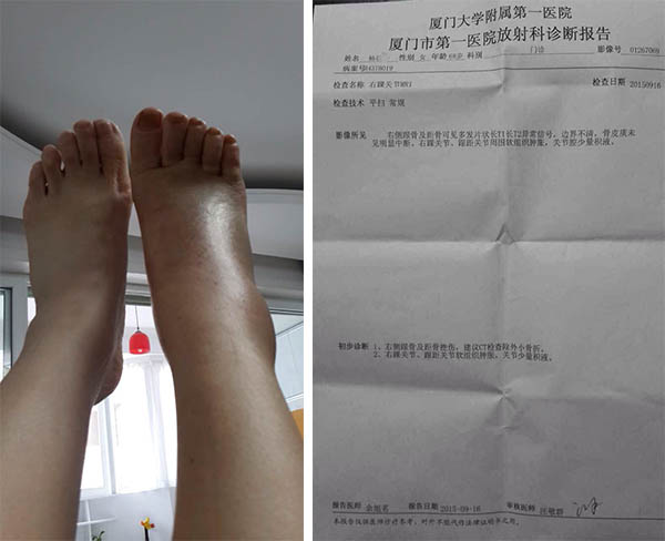 自称旅行团领队的网友提供的照片:涉事中国游客受伤的右脚(左)、该游客回国后在厦门看病时医院出具的诊断报告。