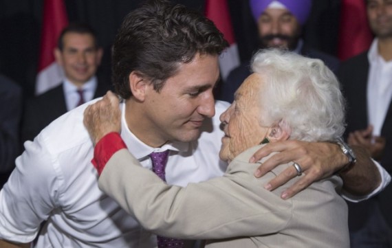 自由党领袖与祖母级支持者、94岁的密西沙加前市长麦考莲拥抱。