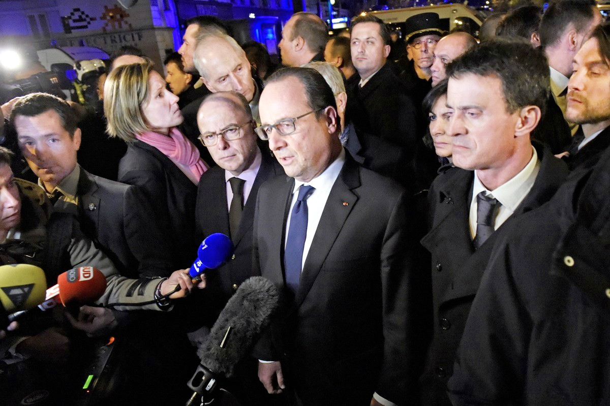 14日,法国巴黎,法国总统奥朗德造访遭袭地点,并对媒体发表讲话。