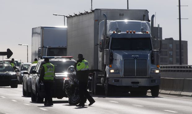 2020年4月2日,货运卡车经过魁北克奎加蒂诺的一个检查站