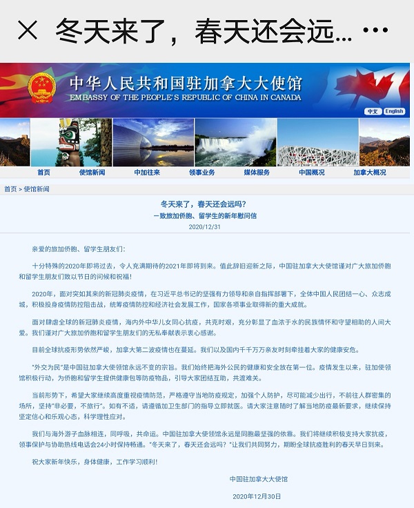 我们与海外游子血脉相连,同呼吸,共命运。中国驻加拿大使领馆永远是同胞最坚强的依靠。我们将继续积极支持大家抗疫,领事保护与协助热线电话会24小时保持畅通。“冬天来了,春天还会远吗?”让我们共同努力,期盼全球抗疫胜利的春天早日到来。