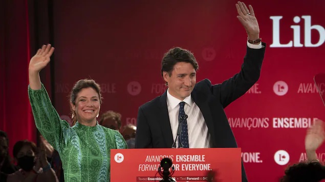 在大选结束后, 特鲁多于星期二 ( 9 月 21日) 凌晨从蒙特利尔市向全国发表了讲话,他的夫人和两个大的孩子站在旁边.